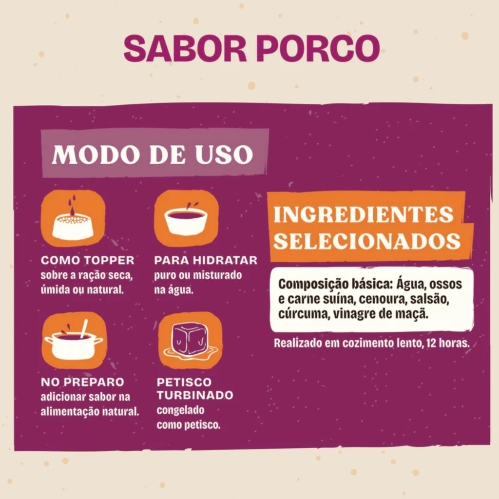 Ingredientes: água, ossos e carne suína, cenoura, salsão, cúrcuma, vinagre de maça