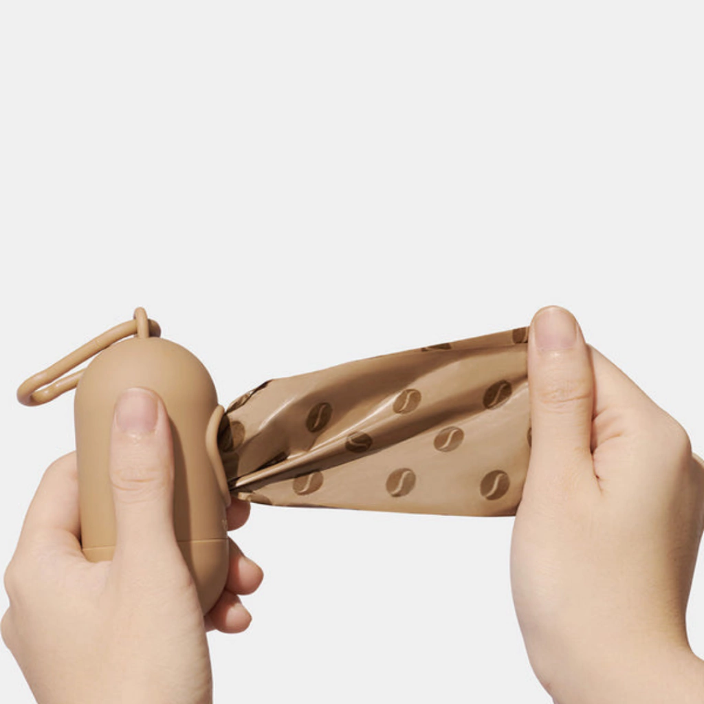 O kit conta com um dispenser compacto em tom de marrom e um rolo com 15 saquinhos biodegradáveis. Cada saquinho é resistente, à prova de vazamentos e perfumado com aroma suave de café recém-passado, garantindo uma experiência mais agradável e higiênica durante a coleta.
