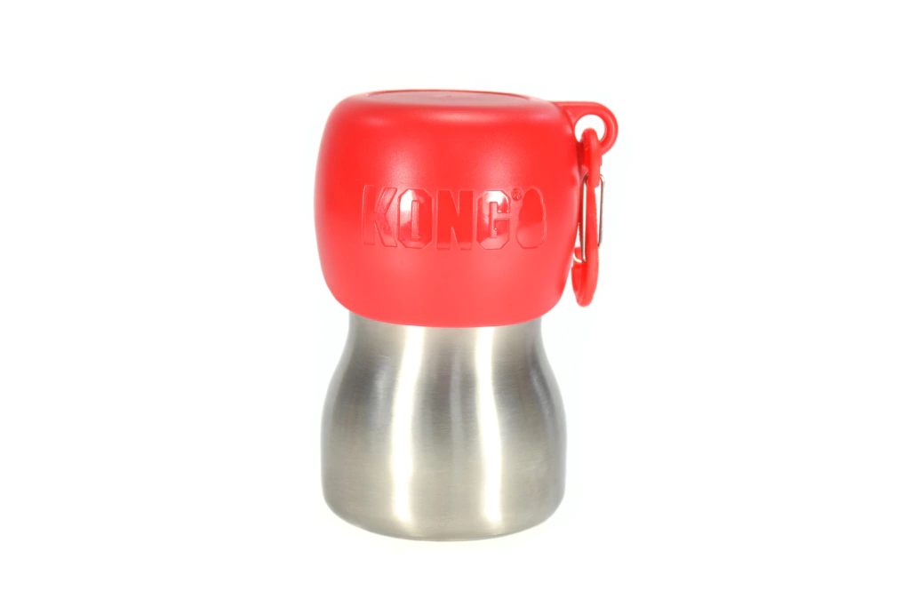 A garrafa de agua KONG H2O é a evolução das garrafas de água para cães, ela tem o design patenteado das tampas para que funcionem como um bebedouro de água seguro para seu cão. O tamanho do bocal de garrafa é grande suficiente para permitir colocar cubos de gelo, são feitas com aço inoxidável de grau alimentar, sem BPA.
