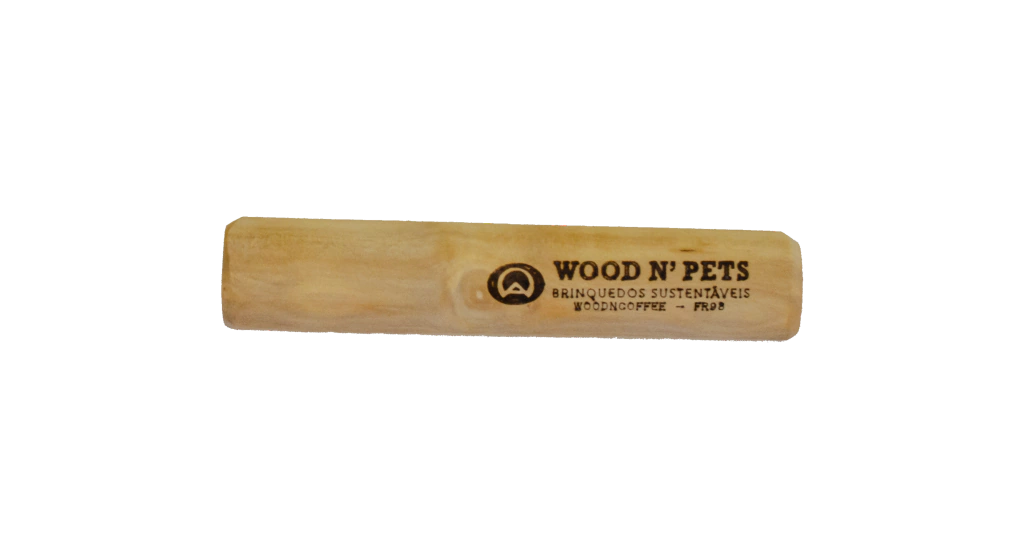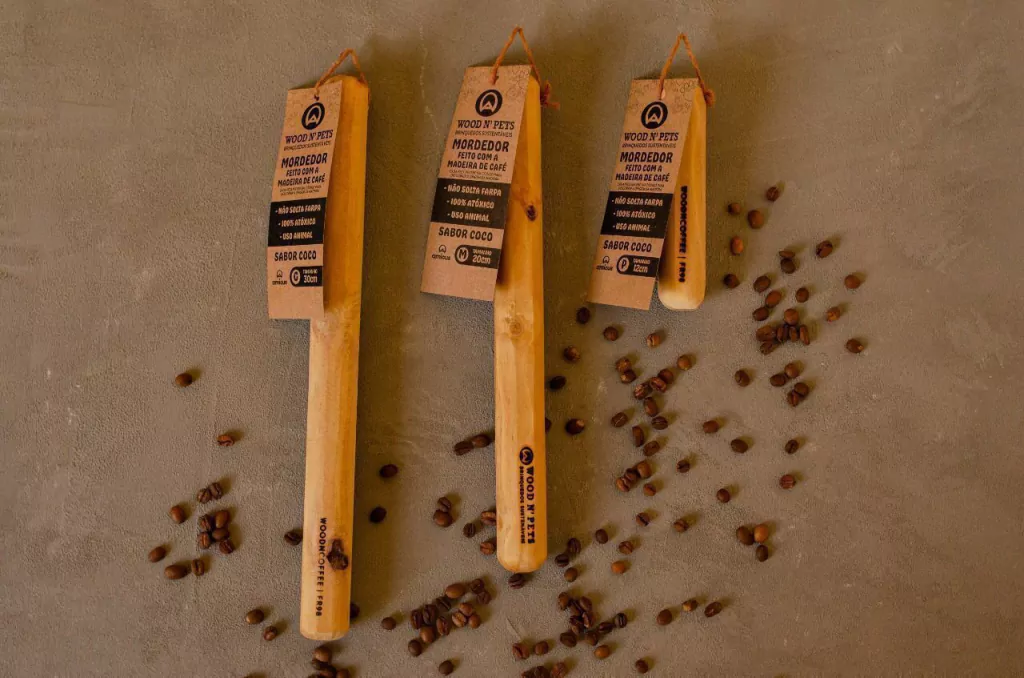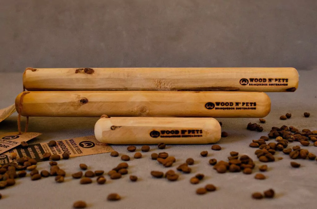 O mordedor sustentável Wood n’Pets é feito da madeira do café. Todos os sticks possuem o código de origem, ele permite identificar de onde a madeira foi retirada e de forma sustentável.