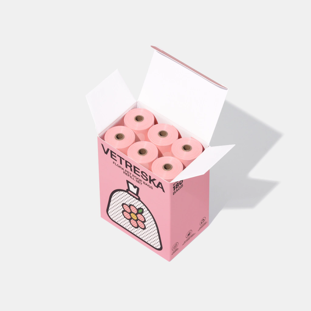 O conjunto inclui 12 rolos de saquinhos biodegradáveis com estampa temática e fragrância floral suave, que ajuda a neutralizar odores indesejáveis durante os passeios.