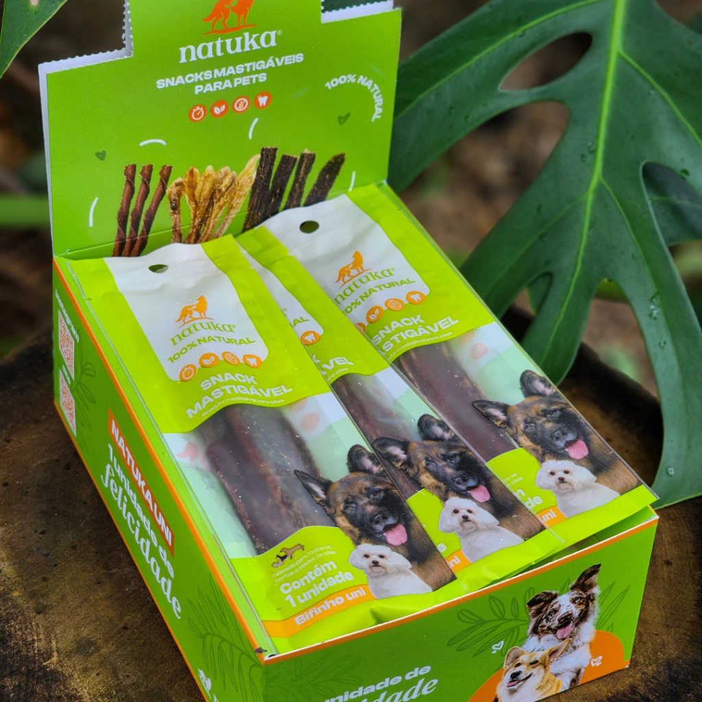 Natuka Uni - Bifinho: esse mastigável é leve e muito atrativo, até para os mais seletivos. De baixa resistência, é perfeito para filhotes, idosos, animais com problemas de dentição e animais de porte pequeno. Para animais de porte médio e grande é um petisco bastante saboroso. Feito 100% de esôfago bovino.
