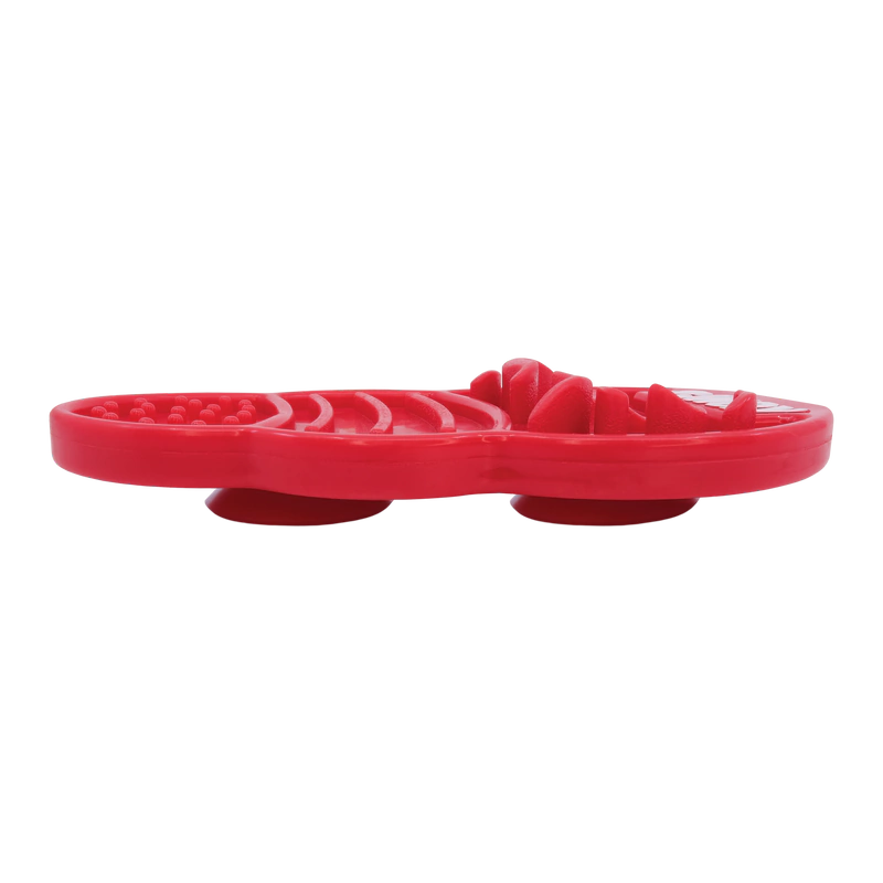 KONG Licks é um brinquedo feito para que o cachorro lamba o conteúdo e, com isso, alivie o estresse, sinta prazer, se distraia e contribua para a limpeza oral. Contém 2 ventosas que aderem à qualquer superfície lisa. Ideal para ser usado com pasta de amendoim e outros petiscos pastosos ou até sólidos. As diferentes superfícies servem para segurar alimento e mudar o desafio durante a sessão de lambidas.